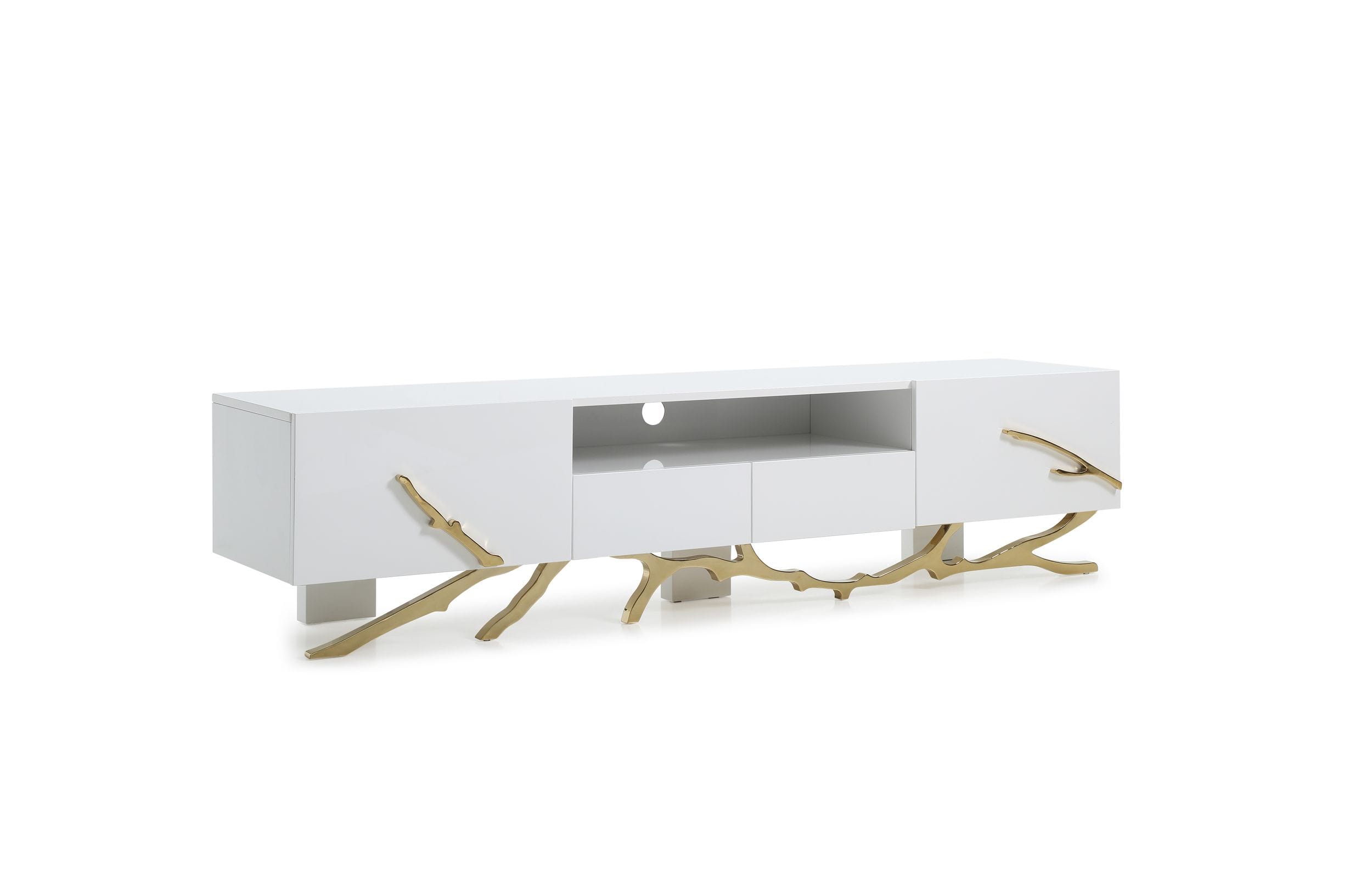 The Modrest Legend TV Stand comes in a dramatic and bold shade of white in a high gloss finish. The rich white finish juxtaposes perfectly with the delicious gold branch style accents. It includes two drawers, two doors, and one electrical wire hole.