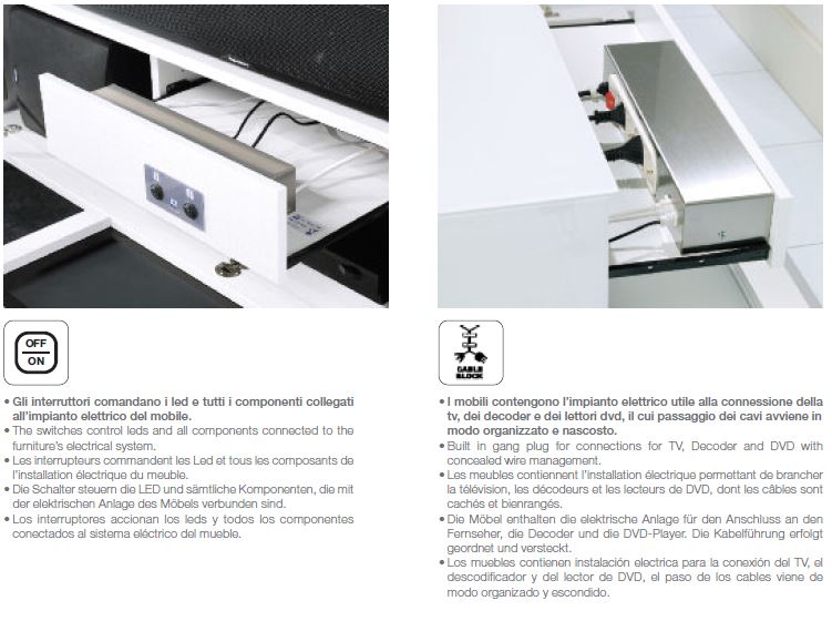 - The switches control LED light and all components connected to the furniture's electrical system.